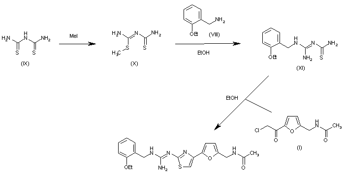 The reaction of dithiobiuret (IX) with methyl iodide in ethanol gives the corresponding S-methyl derivative (X), which is condensed with 2-ethoxybenzylamine (VIII) in ethanol yielding the guanidine (XI). Finally, this compound is cyclized with N-[5-(2-chloroacetyl)furan-2-ylmethylacetamide (I) in ethanol.