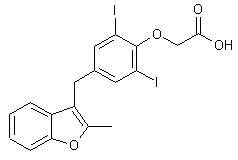 Friedel-Crafts acylation of 2-methylbenzofuran (I) with p-anisoyl chloride (II) in the presence of SnCl4 afforded the benzoyl benzofuran derivative (III). Ketone (III) reduction to the corresponding benzyl benzofuran (IV) was accomplished employing either LiAlH4 or NaBH4 and ZnI2. The methyl ether group of (IV) was then cleaved with melted pyridine hydrochloride to give phenol (V). Aromatic iodination of (V) with either I2/KI or with ICl in morpholine led to the diiodo phenol (VI). This was then alkylated with ethyl bromoacetate (VII) to furnish ester (VIII), which was finally hydrolyzed with NaOH to the target carboxylic acid.