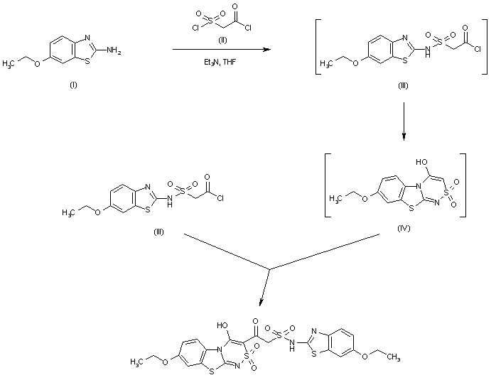 The title compound was obtained in a one-step procedure from 6-ethoxy-2-aminobenzothiazole (I) and chlorosulfonylacetyl chloride (II) in the presence of triethylamine. The initially formed sulfonamido acid chloride (III) cyclized to the benzothiazolo[2,3-c]thiadiazine ring system (IV), which subsequently underwent further acylation with another molecule of acid chloride (III) to furnish the title compound.