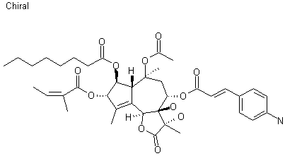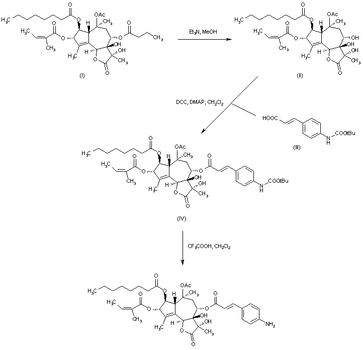 8-O-Debutanoylthapsigargin (II) was obtained by triethylamine-catalyzed methanolysis of thapsigargin (I). Coupling of (II) with N-Boc-4-aminocinnamic acid (III) in the presence of DCC and DMAP provided ester (IV). The Boc protecting group of (IV) was then cleaved by treatment with trifluoroacetic acid.