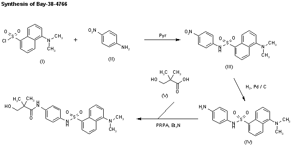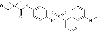 The reaction of 5-(dimethylamino)naphthalene-1-sulfonyl chloride (I) with 4-nitroaniline (II) in pyridine gives the corresponding sulfonamide (III), which is reduced at the nitro group with hydrogen over Pd/C in ethanol, yielding the expected amine (IV). Finally, this compound is condensed with 3-hydroxy-2,2-dimethylpropionic acid (V) by means of propylphosphonic anhydride (PRPA) and triethylamine in dichloromethane/ethyl acetate.