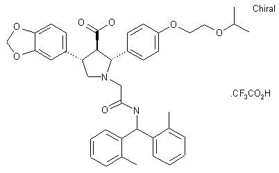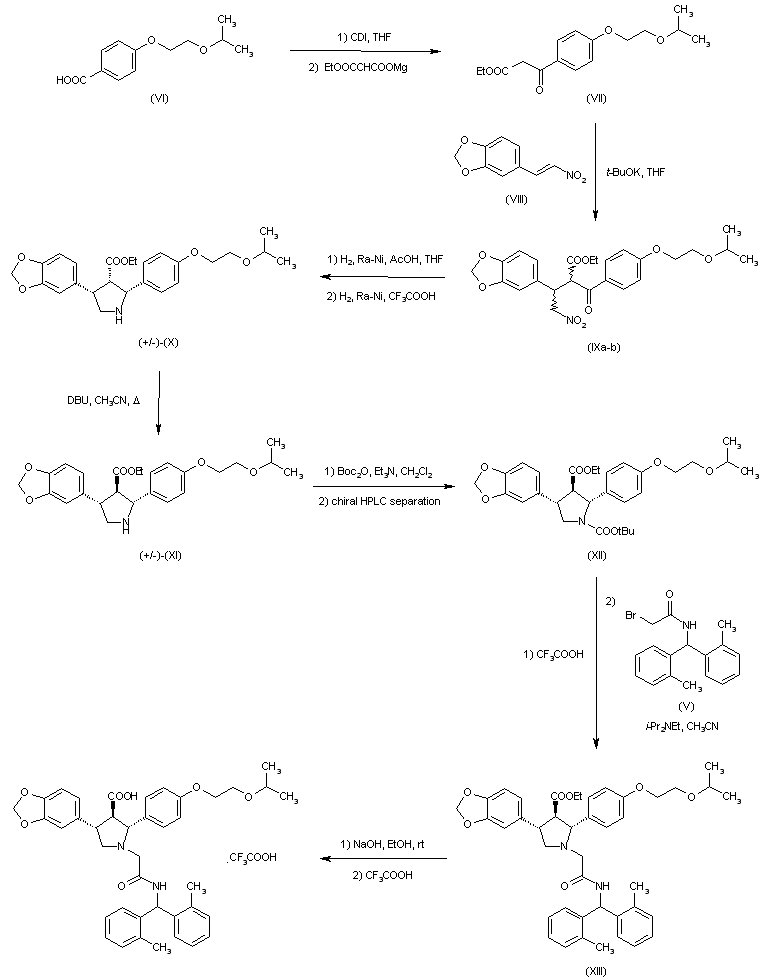 4-(2-Isopropoxyethoxy)benzoic acid (VI) was activated as the corresponding imidiazolide and then condensed with magnesium monoethylmalonate to furnish, after decarboxylation, ketoester (VII). Potassium tert-butoxide-catalyzed Michael addition to (VII) of nitrostyrene (VIII) yielded adduct (IX) as a mixture of diastereoisomers. Hydrogenation of the nitro group of (IX) and further hydrogenation of the intermediate cyclic iminium trifluoroacetate salt provided the racemic cis,cis--pyrrolidine (X) as the major isomer. This was epimerized with DBU to the desired trans,trans-isomer (XI). After conversion of (XI) to the tert-butyl carbamate, resolution was carried out by chiral HPLC separation. The required (2R,3R,4S)-isomer (XII) was deprotected with trifluoroacetic acid and condensed with bromoacetamide (V) to furnish (XIII). The ethyl ester group of (XIII) was hydrolyzed with NaOH, and the title compound was finally converted to the trifluoroacetate salt.