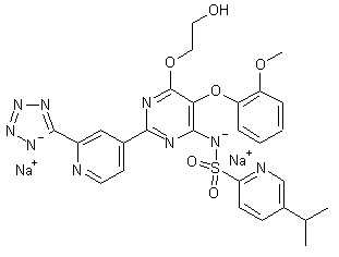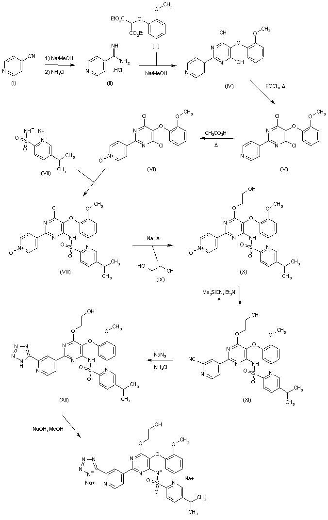 Reaction of 4-cyano-pyridine (I) with Na in methanol followed by treatment with ammonium chloride provides 4-amidino-pyridine hydrochloride (II), which is then converted into 5-(2-methoxyphenoxy)-2-(pyridin-4-yl)-pyrimidine-4,6-diol (IV) by condensation with diethyl malonate derivative (III) by means of Na in MeOH. By heating compound (IV) with phosphorus oxychloride (POCl3), 4,6-dichloro-5-(2-methoxyphenoxy)-2-pyridin-4-yl)pyrimidine (V) is obtained, which in turn is oxidized with peracetic acid in refluxing acetonitrile to afford N-oxide derivative (VI). Condensation of (VI) with 5-isopropylpyridine-2-sulfonamide potassium (VII) furnishes 5-isopropylpyridine-2-sulfonic acid 6-chloro-5-(2-methoxyphenoxy)-2-(1-oxy-pyridin-4-yl)-pyrimidin-4-yl amide (VIII), which is then dissolved in dimethoxyethane and subjected to reaction with Na in hot ethylene glycol (IX) to provide N-[6-(2-hydroxyethoxy)-5-(2-methoxyphenoxy)-2-(1-oxy-pyridin-4-yl)-pyrimidin-4-yl]-5-isopropylpyridine-2-sulfonamide (X). Refluxing of (X) with trimethylsilylcyanide and Et3N in acetonitrile yields cyano derivative (XI), which is then converted into the tetrazole derivative (XII) by reaction with sodium azide and NH4Cl in DMF at 70 C. Finally, the disodium salt of tezosentan is obtained by treatment of (XII) with Na/MeOH in THF.