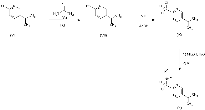 Reaction of 2-chloro-5-ispropylpyridine (VII) with thiourea (A) in aqueous HCl gives 5-isopropyl- pyridine-2-thiol (VIII), which is chlorinated with chlorine in acetic acid to yield 5-isopropylpyridine-2-sulfochloride (IX). This compound is converted into 5-isopropylpyridine-2-sulfonamide potassium salt (X).