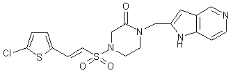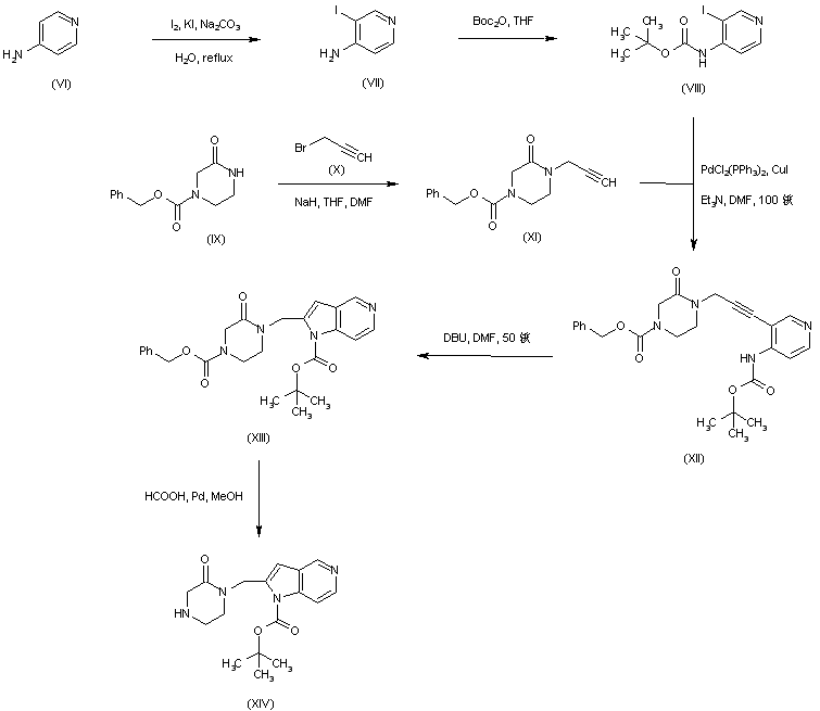 Iodination of 4-aminopyridine (VI), followed by protection with Boc2O, provided the N-Boc iodopyridine (VIII). Piperazinone (XI) was prepared by alkylation of 4-(benzyloxycarbonyl)-2-piperazinone (IX) with propargyl bromide (X). Palladium-catalyzed coupling of propargyl piperazinone (XI) with iodopyridine (VIII) furnished adduct (XII), which was subsequently cyclized to the pyrrolopyridine derivative (XIII) upon treatment with DBU. The benzyloxycarbonyl group of (XIII) was then cleaved by transfer hydrogenolysis to yield the intermediate piperazinone (XIV).