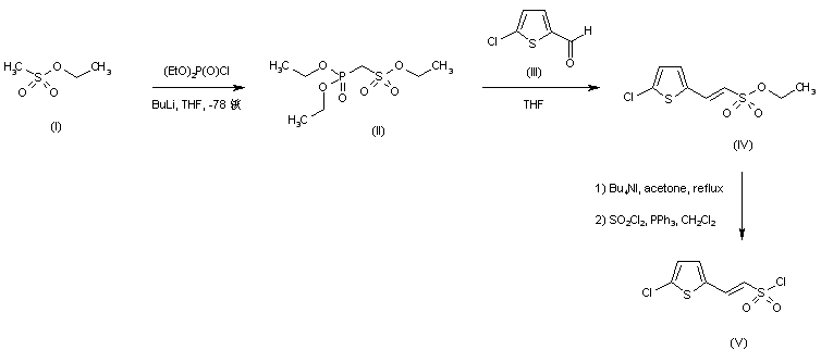 The lithium anion of ethyl methanesulfonate (I) was condensed with ethyl chlorophosphonate to produce the phosphonate (II), which was subsequently subjected to a Wittig reaction with 5-chlorotiophene-2-carboxaldehyde (III), yielding olefin (IV). After cleavage of the ethyl sulfonate of (IV) by means of tetrabutylammonium iodide, treatment with sulfuryl chloride afforded the intermediate sulfonyl chloride (V).
