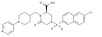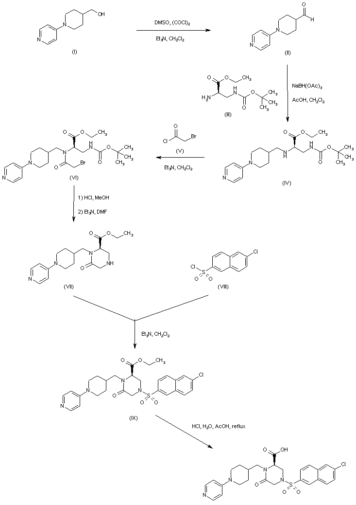 Swern oxidation of 1-(4-pyridinyl)-4-piperidinemethanol (I) affords aldehyde (II). Reductive amination of (II) with the (R)-diaminopropionic acid derivative (III) in the presence of NaBH(OAc)3 yields (IV). Subsequent acylation of (IV) with bromoacetyl chloride (V) provides bromoacetamide (VI). Acidic cleavage of the N-Boc group of (VI), followed by cyclization in the presence of triethylamine leads to piperazinone (VII). Sulfonylation of amine (VII) with 6-chloro-2-naphthalenesulfonyl chloride (VIII) gives (IX). Finally, the target carboxylic acid is obtained by hydrolysis of ethyl ester (IX) under acidic conditions.