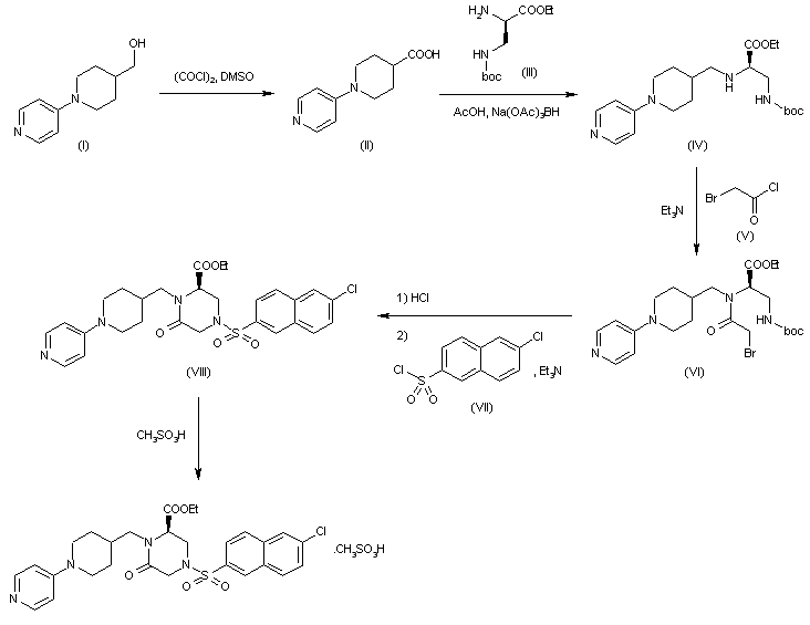 Oxidation of 1-(4-pyridyl)piperidin-4-yl methanol (I) with oxalyl chloride and DMSO in dichloromethane provides carbaldehyde (II), which is then subjected to a reductive amination with amino acid (III) by means of HOAc and triacetoxyborohydride (Na(OAc)3BH) in dichloromethane to provide compound (IV). Condensation of (IV) with bromoacetyl chloride (V) in dichloromethane in the presence of Et3N furnishes derivative (VI), which is converted into compound (VIII) by first removal of the Boc group with HCl in MeOH followed by condensation with 6-chloronaphthalen-2-ylsulfonyl chloride (VII) in dichloromethane/DMF in the presence of Et3N. Finally, the target compound is obtained by treatment of (VIII) with methanesulfonic acid (CH3SO3H) in MeOH.