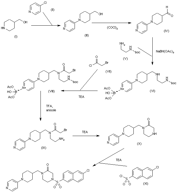 The condensation of 4-piperidinylmethanol (I) with 4-chloropyridine (II) gives 1-(4-pyridyl)piperidin-4-ylmethanol (III), which is oxidized with (COCl)2 and TEA in DMSO to yield the carbaldehyde (IV). The reductocondensation of (IV) with N-(tert-butoxycarbonyl)ethylene-1,2-diamine (V) by means of sodium triacetoxyborohydride and acetic acid affords the corresponding adduct as the borane complex (VI), which is acylated with bromoacetyl chloride (VII) and TEA in dichloromethane, providing the bromoacetamide (VIII). The cleavage of the boron complex and the Boc protecting group of (VIII) with TFA and anisole in ethyl ether gives the precursor (IX), which is cyclized to the piperazinone (X) by means of TEA in DMF. Finally, compound (X) is condensed with 6-chloronaphthalene-2-sulfonyl chloride by means of TEA in dichloromethane to yield the target sulfonamide.