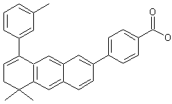 Triflate (XI) was coupled with methyl 4-(tributylstannyl)benzoate (XII) using Pd2(dba)3 and Ph3As to introduce the benzoate side-chain yielding (XIII). Benzylic oxidation of (XIII) with tert-butyl hydroperoxide and pyridinium dichromate provided anthracenone (XIV). Optionally, this was converted to vinyl triflate (XV) by means of trifluoromethanesulfonic anhydride and 2,6-di-tert-butyl-4-methylpyridine (DTBMP). Addition of Grignard reagent (XVI) to ketone (XIV), followed by acid dehydration of the resulting carbinol (XVIII) furnished the diaryl anthracene (XVIII). In an alternative procedure intermediate (XVIII) was prepared by Stille coupling of vinyl triflate (XV) with 3-methyl tributylstannylbenzene (XIX). Finally, the title carboxylic acid was obtained by saponification of the ester group of (XIX) with KOH.