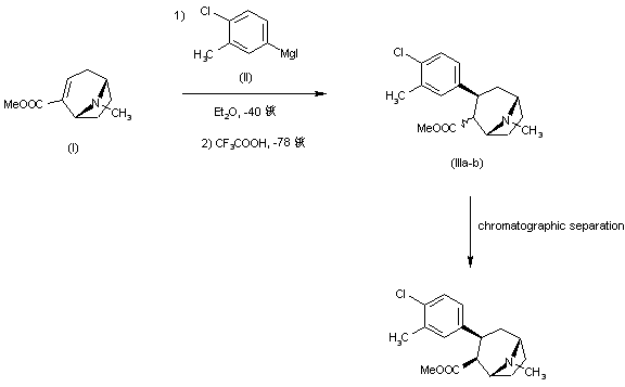 Conjugate addition of 4-chloro-3-methylphenylmagnesium iodide (II) to anhydroecgonine methyl ester (I) at -40 C, followed by quenching with trifluoroacetic acid at -78 C afforded a 1:1.6 mixture of 2alpha and 2beta-3-aryltropane-2-carboxylate esters (III). The target 2beta-isomer was then isolated by column chromatography.