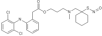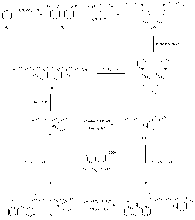 Treatment of cyclohexanecarboxaldehyde (I) with sulfur monochloride produced the dimeric disulfide (II). After condensation of (II) with 3-amino-1-propanol (III), reduction with NaBH4 afforded diamine (IV). Subsequent N-methylation of (IV) to give (VI) was achieved by condensation with formaldehyde, followed by NaBH4 reduction of the resulting oxazine (V). Reductive cleavage of the disulfide group of (VI) using LiAlH4 provided thiol (VII). Optionally, nitrosation of the sulfhydryl group of (VII) by means of tert-butyl nitrite gave rise to the nitrosothio derivative (VIII). Further coupling of this compound with diclofenac (IX) in the presence of DCC and DMAP furnished the title ester. Alternatively, the title compound was prepared by esterification of mercapto alcohol (VII) with diclofenac, followed by S-nitrosation of the resulting ester (X).