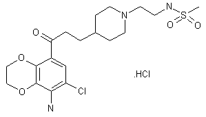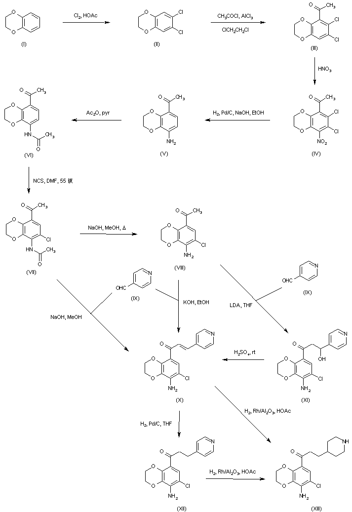 Chlorination of 1,4-benzodioxan (I) in AcOH afforded the 6,7-dichloro derivative (II). Subsequent Friedel-Crafts acylation of (II) with acetyl chloride and AlCl3 produced ketone (III), which was nitrated employing fuming nitric acid to give nitro compound (IV). Hydrogenation of the nitro group of (IV) with concomitant hydrogenolysis of the halogen atoms in the presence of Pd/C yielded amino ketone (V). After protection of the amino group of (V) as the corresponding acetamide (VI), chlorination by means of N-chlorosuccinimide provided (VII). Optionally, amide hydrolysis with NaOH afforded amine (VIII). Aldol condensation of (VIII) with pyridine-4-carboxaldehyde (IX) in ethanolic KOH gave rise to the unsaturated ketone (X). This compound was also obtained by condensation of the N-acetylated amino ketone (VII) with aldehyde (IX) in methanolic NaOH. In a related procedure, the aldol condensation of ketone (VIII) with aldehyde (IX) using LDA in cold THF produced hydroxy ketone (XI). This was further dehydrated to unsaturated ketone (X) by means of concentrated H2SO4. Hydrogenation of the olefinic double bond of (X) over Pd/C in THF generated the saturated ketone (XII). Further hydrogenation of the pyridine ring of (XII) using Rh/Al2O3 furnished the corresponding piperidine (XIII). Alternatively, (XIII) was obtained by direct hydrogenation of (X) over Rh/Al2O3.