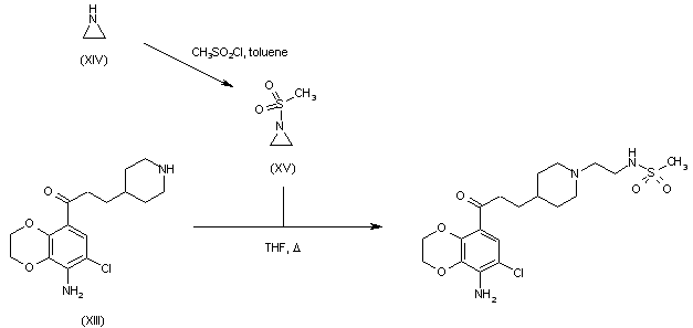 Acylation of aziridine (XIV) with methanesulfonyl chloride produced sulfonamide (XV). This was then condensed with piperidine (XIII) to yield the target sulfonylaminoethyl piperidine.