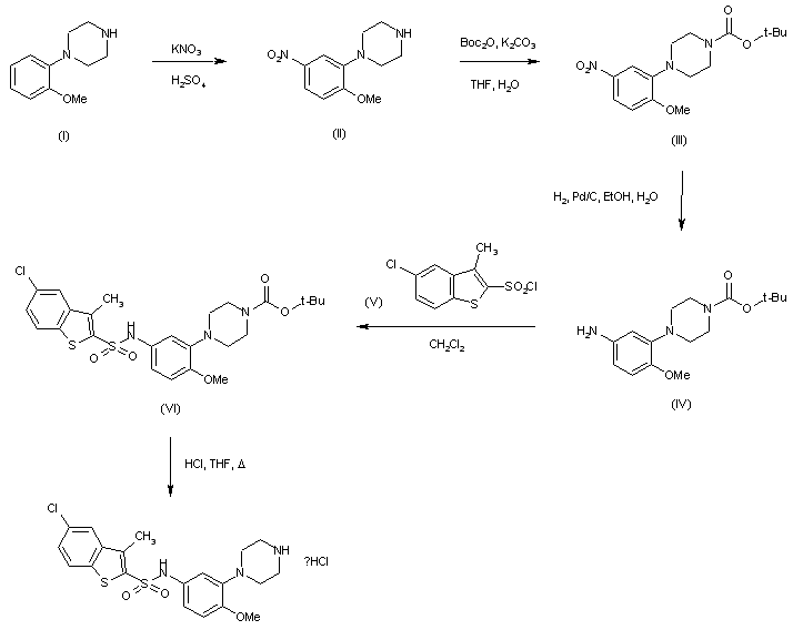 Nitration of 1-(2-methoxyphenyl)piperazine (I) using KNO3 in H2SO4 gave (II). After protection of (II) as the N-Boc derivative (III), reduction of the nitro group by catalytic hydrogenation over Pd/C yielded aniline (IV). This was condensed with 5-chloro-3-methylbenzothiophene-2-sulfonyl chloride (V) to afford the corresponding sulfonamide (VI). Finally, the Boc protecting group of (VI) was removed with HCl in boiling THF.