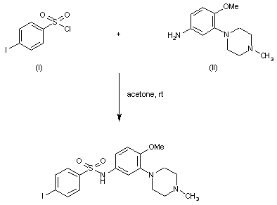 The title sulfonamide was prepared by coupling 4-methoxy-3-(4-methylpiperazin-1-yl)aniline (II) with 4-iodobenzenesulfonyl chloride (I) in acetone.