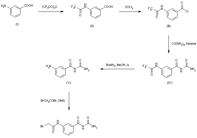 The acylation of 3-aminobenzoic acid with acetic anhydride in ethyl acetate gives the corresponding acetamide (II), which is treated with SOCl2 in refluxing ethyl acetate yielding 3-(trifluoroacetamido)benzoyl chloride (III). The reaction of (III) with urea (IV) in toluene at 100 C gives the acylated urea (V), which is deprotected with butylamine in refluxing methanol to afford N-(3-aminobenzoyl)urea (VI). The acylation of (VI) with chloroacetyl chloride (VII) in dimethylacetamide provides the corresponding amide (VIII), which is finally treated with NaI in dimethylacetamide.