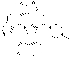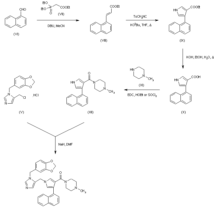 Horner-Emmons condensation of 1-naphthaldehyde (VI) with triethyl phosphonoacetate (VII) using DBU as the base afforded naphthylacrylate (VIII). This was reacted with tosylmethylisocyanide and potassium tert-butoxide to produce pyrrole (IX). Hydrolysis of the ester group of (IX) with KOH gave rise to the carboxylic acid (X), which was coupled with N-methylpiperazine (XI) employing EDC and HOBt or, alternatively, by previous conversion to the corresponding acid chloride with SOCl2. The resulting amide (XII) was finally alkylated at the pyrrole N atom with chloride (V) in the presence of NaH.