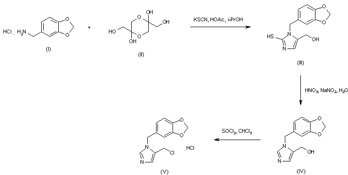 The condensation of piperonylamine (I) with dihydroxyacetone dimer (II) in the presence of potassium thiocyanate produced the mercaptoimidazole (III), which was desulfurized upon treatment with nitric acid and sodium nitrite. The resulting (hydroxymethyl)imidazole (IV) was then converted to the corresponding chloride (V) employing thionyl chloride in chloroform.