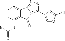 Dimethyl 3-nitrophthalate (I) was hydrogenated in the presence of Pd/C to give aminophthalate (II), which was acylated with Ac2O in pyridine, yielding acetamidophthalate (III). Condensation of phthalate ester (III) with 4-acetyl-2-chlorothiophene (IV) using NaH in DMF produced triketone (V). After acid hydrolysis of the amide function of (V), the resulting aminoindenetrione (VI) was cyclized with hydrazine hydrate to generate the indenopyrazolone system (VII). Condensation of (VII) with phenyl chloroformate afforded the phenyl carbamate (VIII). This was finally treated with concentrated ammonia to furnish the target urea derivative.
