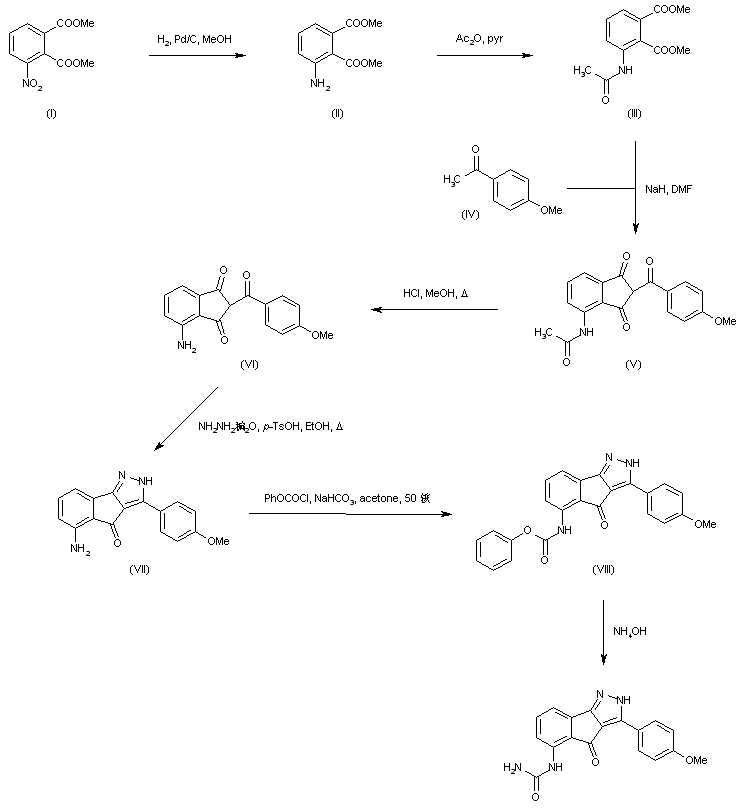 Dimethyl 3-nitrophthalate (I) was hydrogenated in the presence of Pd/C to give aminophthalate (II), which was acylated with Ac2O in pyridine, yielding acetamidophthalate (III). Condensation of phthalate ester (III) with 4'-methoxyacetophenone (IV) using NaH in DMF produced triketone (V). After acid hydrolysis of the amide function of (V), the resulting aminoindenetrione (VI) was cyclized with hydrazine hydrate to generate the indenopyrazolone system (VII). Condensation of (VII) with phenyl chloroformate afforded the phenyl carbamate (VIII). This was finally treated with concentrated ammonia to furnish the target urea derivative.