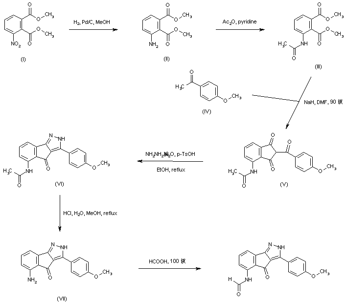 Catalytic hydrogenation of dimethyl 3-nitrophthalate (I) in the presence of Pd/C afforded the corresponding amino derivative (II), which was subsequently acetylated with Ac2O in pyridine yielding amide (III). Claisen condensation of diester (III) with 4'-methoxyacetophenone (IV) using NaH in hot DMF furnished the indandione (V). The tricarbonyl intermediate (V) was then treated with hydrazine to give the indenopyrazole (VI) as a single regioisomer. Acidic hydrolysis of the acetamide function of (VI) provided amine (VII). This was finally converted to the target formamide derivative upon heating with neat formic acid.
