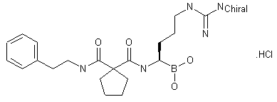 Carbethoxylation of cyclopentanecarboxylic acid (VIII) with ethyl chloroformate and LDA afforded monoethyl cyclopentane-1,1-dicarboxylate (IX), which was coupled with phenethylamine (X) in the presence of TBTU, yielding amide (XI). Subsequent saponification of the ethyl ester group of (XI) gave carboxylic acid (XII), which was activated as the mixed anhydride (XIII) with isobutyl chloroformate and triethylamine. Coupling of this anhydride with aminoboronate (VII) produced the bisamide (XIV). After displacement of the bromine of (XIV) with NaN3, the resulting azide (XV) was reduced to amine (XVI) by hydrogenation over Pd/C. The required guanidine (XVII) was then obtained by condensation of (XVI) with cyanamide in refluxing EtOH. Finally, cleavage of the boronate ester by exchange with phenylboronic acid in the presence of benzenesulfonic acid furnished the title compound.