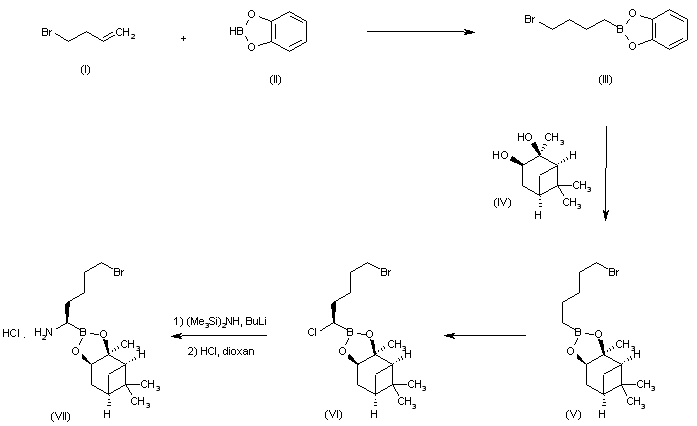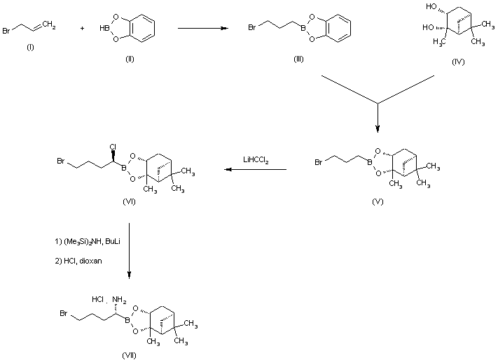 Coupling of 4-bromo-1-butene (I) with catecholborane (II) afforded the bromobutyl boronate (III). Subsequent exchange of (III) with alpha-pinanediol (IV) produced (V), which was regioselectively chlorinated to give (VI). Displacement of the chlorine atom of (VI) with lithium hexamethyldisilazide, followed by acid treatment furnished intermediate (VII).