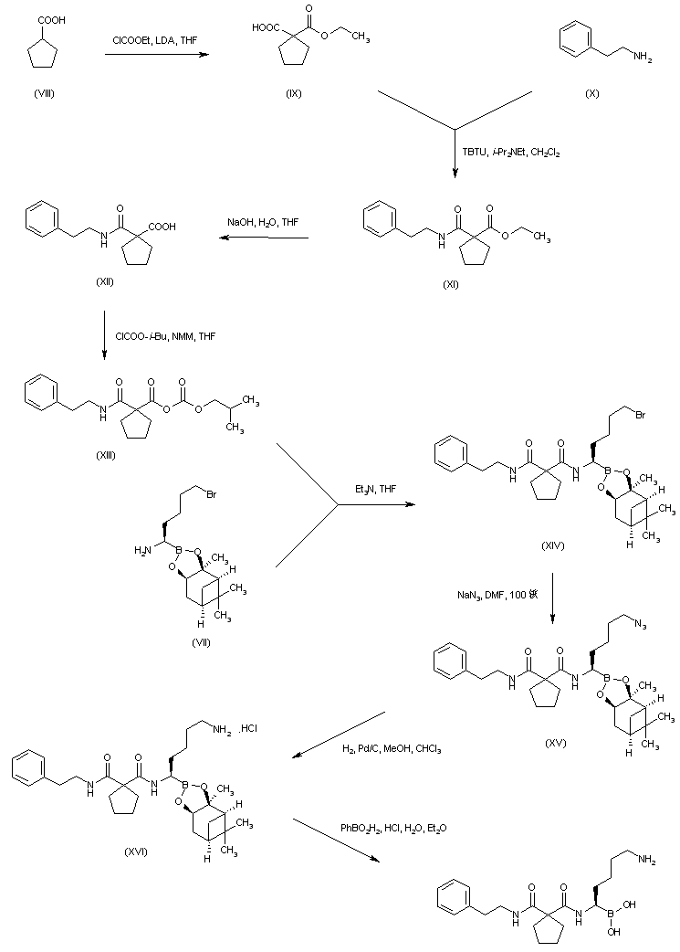 Condensation of cyclopentanecarboxylic acid (VIII) with ethyl chloroformate in the presence of LDA afforded 1,1-cyclopentanedicarboxylic acid monoethyl ester (IX), which was coupled with phenethylamine (X) by means of TBTU to produce amide (XI). Ester hydrolysis of (XI) with NaOH gave carboxylic acid (XII), which was activated as the mixed anhydride (XIII) with isobutyl chloroformate, and then coupled to the chiral aminoboronate (VII), yielding diamide (XIV). Displacement of the bromine of (XIV) with NaN3, followed by hydrogenation of the resulting azide (XV) gave rise to amine (XVI). The chiral auxiliary of (XVI) was finally removed by treatment with phenylboronic acid.
