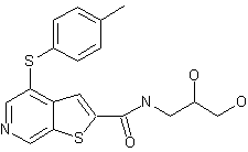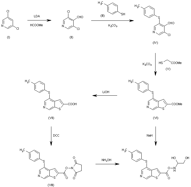 The formylation of 3,5-dichloropyridine (I) with methyl formate by means of lithium diisopropylamide (LDA) in THF gives 3,5-dichloropyridine-4-carbaldehyde (II), which is condensed with p-thiocresol (III) by means of K2CO3 in DMF (or t-BuOK in THF) yielding 3-chloro-5-(4-methylphenylsulfanyl)pyridine-4-carbaldehyde (IV). The cyclization of (IV) with methyl thioglycolate (V) by means of K2CO3 in DMF affords 4-(4-methylphenylsulfanyl)thieno[2,3-c]pyridine-2-carboxylic acid methyl ester (VI), which is finally condensed with 2,3-dihydroxypropylamine (VII) by means of NaH in DMF to obtain the target amide. Alternatively, The hydrolysis of the methyl ester (VI) with LiOH in hot isopropanol/water gives the corresponding free acid (VIII), which is treated with N-hydroxysuccinimide (IX) and DCC in dichloromethane to obtain the activated ester (X). Finally, this compound is treated with 2,3-dihydroxypropylamine (VII) in dioxane/methanol to afford the target amide. The activation of the acid (VIII) can also be performed with oxalyl chloride or EDC and HOBT.