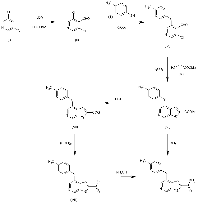 The formylation of 3,5-dichloropyridine (I) with methyl formate by means of lithium diisopropylamide (LDA) in THF gives 3,5-dichloropyridine-4-carbaldehyde (II), which is condensed with p-thiocresol (III) by means of K2CO3 in DMF (or t-BuOK in THF) yielding 3-chloro-5-(4-methylphenylsulfanyl)pyridine-4-carbaldehyde (IV). The cyclization of (IV) with methylthioglycolate (V) by means of K2CO3 in DMF affords 4-(4-methylphenylsulfanyl)thieno[2,3-c]pyridine-2-carboxylic acid methyl ester (VI), which is finally treated with ammonia in methanol to obtain the target amide. Alternatively, The hydrolysis of the methyl ester (VI) with LiOH in hot isopropanol/water gives the corresponding free acid (VII), which is treated with oxalyl chloride in dichloromethane to obtain the acyl chloride (VIII). Finally, this compound is treated with NH4OH in THF/water to afford the target amide.