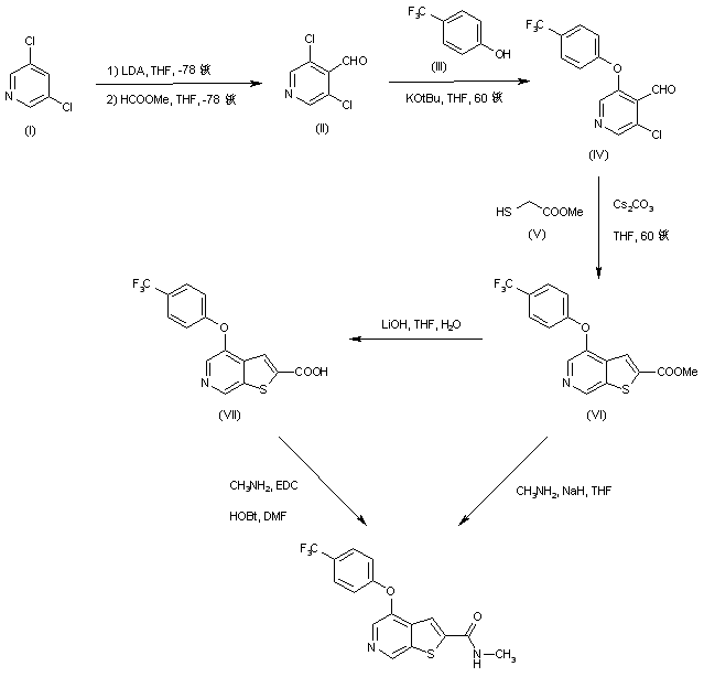 Lithiation of 3,5-dichloropyridine (I) using LDA in cold THF, followed by treatment with methyl formate, furnished aldehyde (II). Subsequent reaction of (II) with the potassium salt of 4-(trifluoromethyl)phenol (III) provided the diaryl ether (IV). Without isolation, (IV) was further condensed with methyl thioglycolate (V) in the presence of Cs2CO3, yielding the thienopyridine (VI). The title amide was then obtained by displacement of the methyl ester of (VI) with methylamine in the presence of NaH. Alternatively, ester (VI) was first hydrolyzed to acid (VII) and then condensed with methylamine employing EDC and HOBt.
