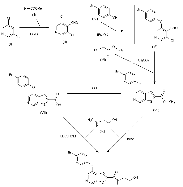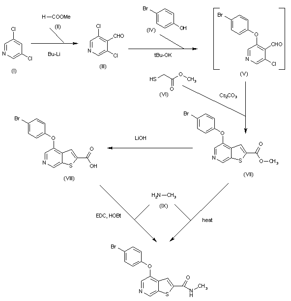 The formylation of 3,5-dichloropyridine (I) with methyl formate (II), BuLi and DIEA in THF gives 3,5-dichloropyridine-4-carbaldehyde (III), which is treated with 4-bromophenol (IV) and potassium tert-butoxide in hot THF to yield the adduct (V). This compound, without isolation is cyclized with methyl 2-mercaptoacetate (VI) by means of Cs2CO3 to afford 4-(4-bromophenoxy)thieno[2,3-c]pyridine-2-carboxylic acid methyl ester (VII), which is hydrolyzed with LiOH in THF/water to provide the corresponding carboxylic acid (VIII). Finally, this compound is condensed with methylamine (IX) by means of EDC and HOBt in DMF to give the target amide. Alternatively, the target amide can also be obtained by direct reaction of methyl ester (VII) with methylamine (IX) in hot methanol in a sealed tube.