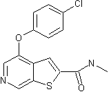 The formylation of 3,5-dichloropyridine (I) with methyl formate (II), BuLi and DIEA in THF gives 3,5-dichloropyridine-4-carbaldehyde (III), which is treated with 4-bromophenol (IV) and potassium tert-butoxide in hot THF to yield the adduct (V). This compound, without isolation is cyclized with methyl 2-mercaptoacetate (VI) by means of Cs2CO3 to afford 4-(4-bromophenoxy)thieno[2,3-c]pyridine-2-carboxylic acid methyl ester (VII), which is hydrolyzed with LiOH in THF/water to provide the corresponding carboxylic acid (VIII). Finally, this compound is condensed with methylamine (IX) by means of EDC and HOBt in DMF to give the target amide. Alternatively, the target amide can also be obtained by direct reaction of methyl ester (VII) with methylamine (IX) in hot methanol in a sealed tube.