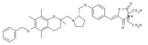 The known benzofuran carbinol (I) was converted to mesylate (II) upon treatment with methanesulfonyl chloride and triethylamine and then condensed with (S)-prolinol (III) at 120 C to afford adduct (IV). Subsequent chlorination of (IV) with concomitant rearrangement by means of thionyl chloride in benzene produced the 3-chloropiperidine derivative (V). The reaction of (V) with 4-hydroxybenzaldehyde (VI) in the presence of K2CO3 in DMF at 80 C furnished a mixture of six- and five-membered ring products (VII) and (VIII), which were separated by column chromatography. Condensation of the required aldehyde (VIII) with thiazolidinedione (IX) using piperidinium benzoate in refluxing toluene provided the target benzylidene thiazolidine, which was finally converted to the corresponding maleate salt.