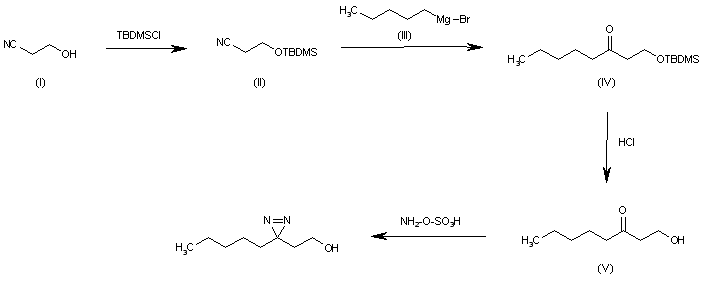 The protection of the OH group of 2-hydroxyacetonitrile (I) with TBDMS-Cl and imidazole in THF gives the silyl ether (II), which is treated with pentylmagnesium bromide (III) in ethyl ether yielding the protected 1-hydroxyoctan-3-one (IV), which is deprotected with HCl in methanol/water affording the corresponding hydroxyketone (V). Finally, this compound is treated with hydroxylamine-O-sulfonic acid in liquid ammonia.