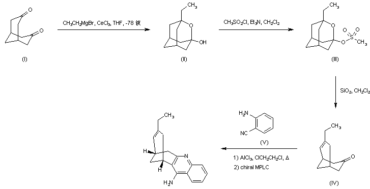 Condensation of diketone (I) with the organocerium reagent derived from methylmagnesium bromide and CeCl3 afforded the oxaadamantanol (II), which was further converted to mesylate (III) upon reaction with methanesulfonyl chloride and Et3N. Subsequent fragmentation of (III) by treatment with silica gel in CH2Cl2 produced bicyclic enone (IV). This was condensed with 2-aminobenzonitrile (V) in the presence of AlCl3 in refluxing 1,2-dichloroethane to furnish the target tetracyclic derivative. Resolution was then achieved by chiral MPLC.