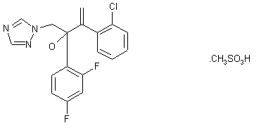 The intermediate epoxide (IV) was synthesized by two different procedures: 1) The Grignard reagent (II), prepared from 1-bromo-2'-chlorostyrene (I) and Mg, was condensed with 2-chloro-2',4'-difluoroacetophenone (III) to afford epoxide (IV). 2) Alternatively, Wittig reaction of epoxyketone (V) with methylenetriphenylphosphorane provided the target intermediate (IV). The title compound was then obtained by epoxide opening of (IV) with potassium triazole (VI) in DMF at 60 C, and was isolated as the methanesulfonate salt.