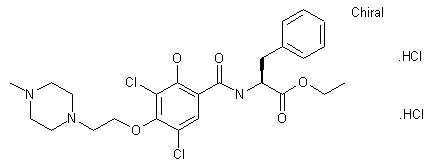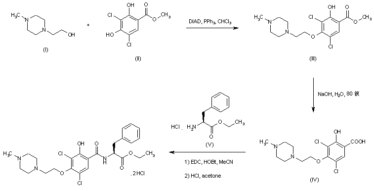 | 合成路线图解说明: Mitsunobu coupling of 2-(4-methylpiperazin-1-yl)ethanol (I) with 3,5-dichloro-2,4-dihydroxybenzoic acid (II) in the presence of diisopropyl azodicarboxylate and triphenylphosphine afforded ether (III). Subsequent hydrolysis of the methyl ester group of (III) provided acid (IV), which was coupled with L-phenylalanine methyl ester-HCl (V) employing EDC and HOBt. The title compound was finally isolated as the corresponding dihydrochloride salt. |