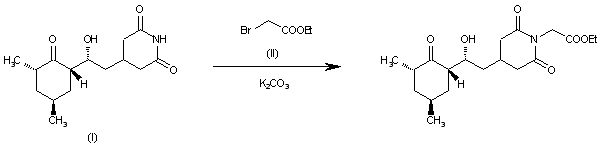 By condensation of cycloheximide (I) with ethyl 2-bromoacetate (II) by means of K2CO3 and 18-crown-6 in acetone.