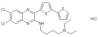 The condensation of 4,5-dichloro-1,2-phenylenediamine (I) with diethyl oxalate (II) produced quinoxalinedione (III), which was brominated with PBr5 at 155 C to afford the dibromo derivative (IV). Displacement of one bromine group of (IV) with 4-(diethylamino)butylamine (V) furnished (VI). The remaining bromine of (VI) was then displaced with 5-(tributylstannyl)-2,2'-bithienyl (VII) to produce the title compound, isolated as the corresponding hydrochloride salt.