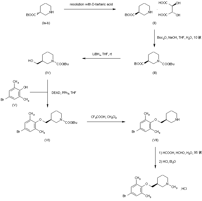 | 合成路线图解说明: Racemic ethyl 3-piperidinecarboxylate (Ia, Ib) was resolved with D-(-)-tartaric acid in EtOH to afford the (S)-piperidine tartrate salt (II). After protection of (II) as the N-Boc derivative (III) by treatment with di-tert-butyl dicarbonate and NaOH, reduction of the carboxylate group of (III) by means of LiBH4 provided alcohol (IV). Subsequent coupling of (IV) with 4-bromo-2,6-dimethylphenol (V) under Mitsunobu conditions provided ether (VI). The N-Boc protecting group of (VI) was then cleaved employing trifluoroacetic acid to give piperidine (VII). Finally, Eschweiler-Clarke methylation using formaldehyde and formic acid furnished the corresponding N-methyl piperidine, which was isolated after conversion to the hydrochloride salt. |