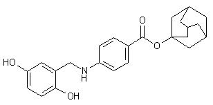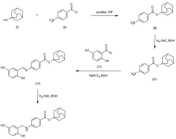 1-Adamantanol (I) was esterified with 4-nitrobenzoyl chloride (II) in the presence of pyridine, yielding adamantanyl 4-nitrobenzoate (III). After catalytic hydrogenation of the nitro group of (III), the resultant aniline (IV) was condensed with 2,5-dihydroxybenzaldehyde (V) to afford the corresponding Schiff base (VI). Subsequent hydrogenation of the imine double bond of (VI) over Pd/C gave rise to the target amine.