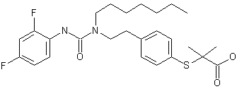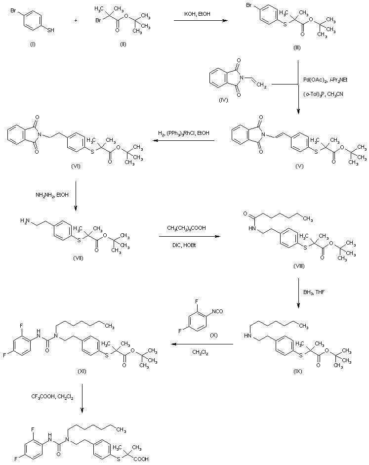 4-Bromothiophenol (I) was alkylated with tert-butyl bromoisobutyrate (II) to give the bromoester (III). Heck reaction of (III) with vinylphthalimide (IV) produced adduct (V), which was hydrogenated in the presence of Wilkinson's catalyst to yield the arylethyl phthalimide (VI). Following phthalimide deprotection with hydrazine, the resulting primary amine (VII) was coupled with heptanoic acid using diisopropyl carbodiimide and hydroxybenzotriazole affording amide (VIII). Borane reduction of (VIII) furnished the secondary amine (IX), which was condensed with 2,4-difluorophenyl isocyanate (X) to give urea (XI). Finally, trifluoroacetic acid-promoted cleavage of the tert-butyl ester of (IX) provided the title carboxylic acid.