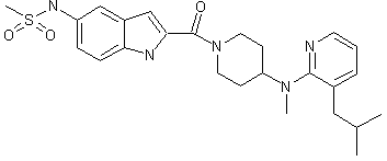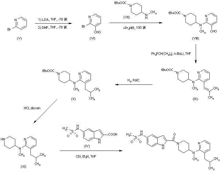 Deprotonation of 2-bromopyridine (V) with LDA and subsequent quenching with dimethylformamide provided 2-bromo-3-formylpyridine (VI). Nucleophilic substitution of the bromine of (VI) with N-Boc-4-(methylamino)piperidine (VII) in diisopropylethylamine at 100 C in a sealed tube yielded aminopyridine derivative (VIII). Then, Wittig olefination of (VIII) with the ylide resulting from isopropyl triphenylphosphonium iodide and n-BuLi introduced the isobutenyl substituent giving (IX), and further catalytic hydrogenation furnished the isobutyl derivative (X). The Boc group of (X) was deprotected by treatment with HCl in dioxan to give piperidine (XI). Finally, coupling of (XI) with indolecarboxylic acid (IV) via activation with carbonyl diimidazole yielded the title carboxamide.