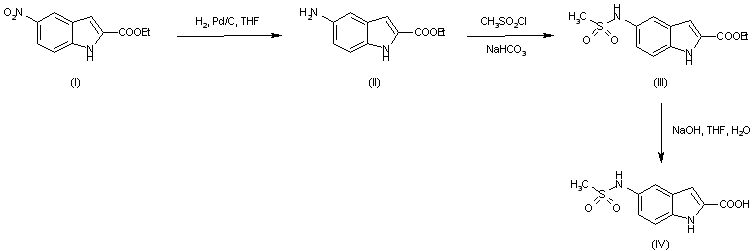 Ethyl 5-nitroindole-2-carboxylate (I) was hydrogenated over Pd/C to give amino indole (II), which was condensed with methanesulfonyl chloride, affording sulfonamide (III). Subsequent hydrolysis of the ester group of (III) furnished the intermediate indolecarboxylic acid (IV).