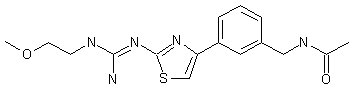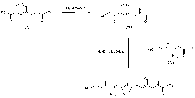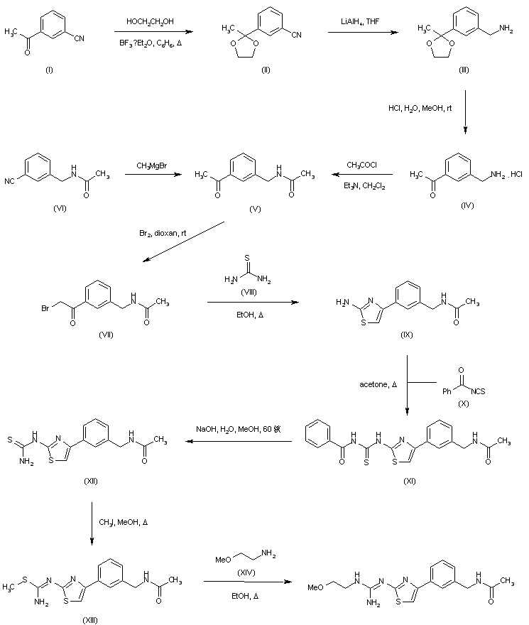 3-Acetylbenzonitrile (I) was protected as the ethylene ketal (II) employing ethylene glycol and boron trifluoride etherate. Reduction of the cyano group of (II) with LiAlH4 gave amine (III), and further ketal hydrolysis provided 3-acetylbenzylamine (IV). This was acetylated using acetyl chloride and Et3N to yield the intermediate amide (V). Alternatively, intermediate (V) was obtained by addition of methylmagnesium bromide to N-(3-cyanobenzyl)acetamide (VI). Bromination of (V) in dioxan furnished the bromoacetophenone (VII). This was cyclized to the aminothiazole (IX) by treatment with thiourea (VIII) in refluxing ethanol. Condensation of (IX) with benzoyl isothiocyanate (X) provided the benzoyl thiourea (XI). After selective hydrolysis of the benzoyl group of (XI) with NaOH in MeOH-H2O at 60 C, the resulting thiourea (XII) was methylated with iodomethane yielding S-methylisothiourea (XIII). Finally, displacement of the methylthio group with 2-methoxyetylamine (XIV) furnished the title guanidinothiazole.