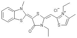N-Methylation of 2-(methylsulfanyl)benzothiazole (I) using methyl p-toluenesulfonate afforded iminium salt (II), which was condensed with 3-ethyl-4-oxothiazolidine-2-thione (III) to give the benzothiazolinylidene dervative (IV). Subsequent S-methylation of (IV) to produce the 3-ethyl-2-(methylthio)thiazolinium salt (V) was followed by condensation with 2,4-dimethyl-3-ethylthiazolium salt (VI) in the presence of Et3N, yielding the triheterocyclic system (VIII) as the p-toluenesulfonate salt. Finally, conversion to the title chloride salt was achieved by means of an anionic exchange resin.