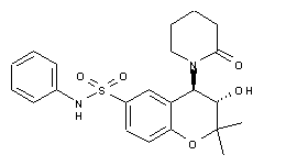 Asymmetric epoxidation of benzopyran (IV) using NaOCl in the presence of the chiral catalyst (S,S)-(+)-N,N'-bis(3,5-di-t-butylsalicylidene)-1,2-cyclohexanediaminomanganese (III) chloride produced the desired (S,S)-epoxide (X). The title compound was then obtained by oxirane ring opening in (X) with the lithium derivative of 2-piperidinone (XI) in hot THF.