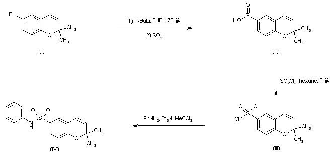 Lithiation of 6-bromo-2,2-dimethyl-2H-1-benzopyran (I), followed by treatment with sulfur dioxide, gave the sulfinic acid (II), which was subsequently chlorinated to sulfonyl chloride (III) employing SO2Cl2. Condensation of sulfonyl chloride (III) with aniline furnished the target N-phenyl sulfonamide (IV).